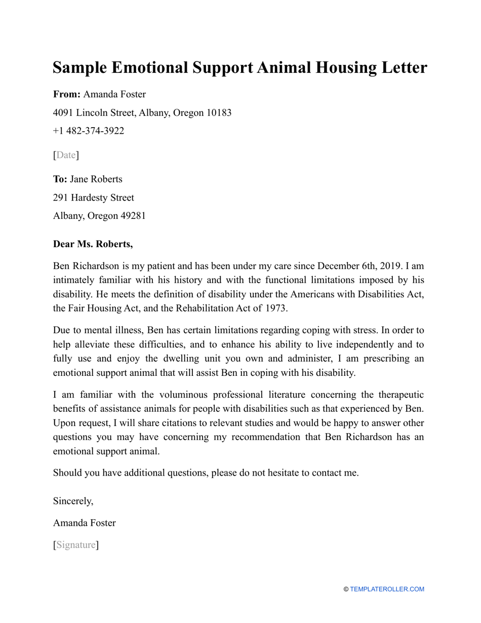 Emotional Support Animal Letter ESA Letter ESA Letter Template