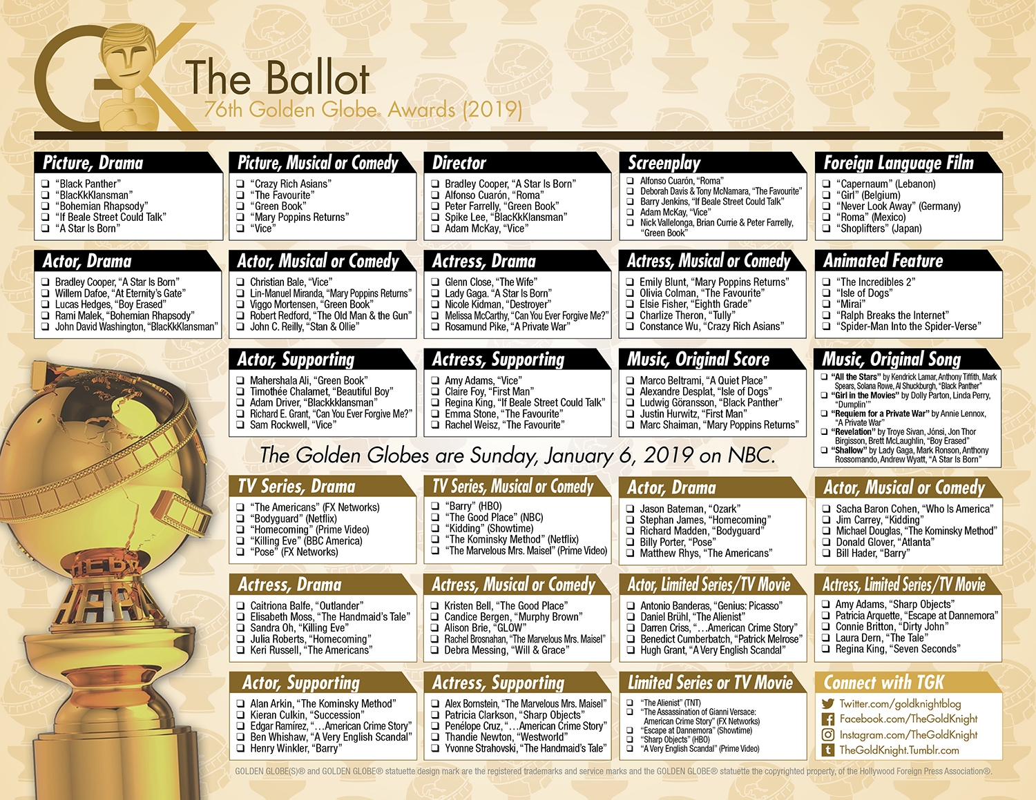 2019 Golden Globe Awards Printable Ballot The Gold Knight Latest Academy Awards News And Insight