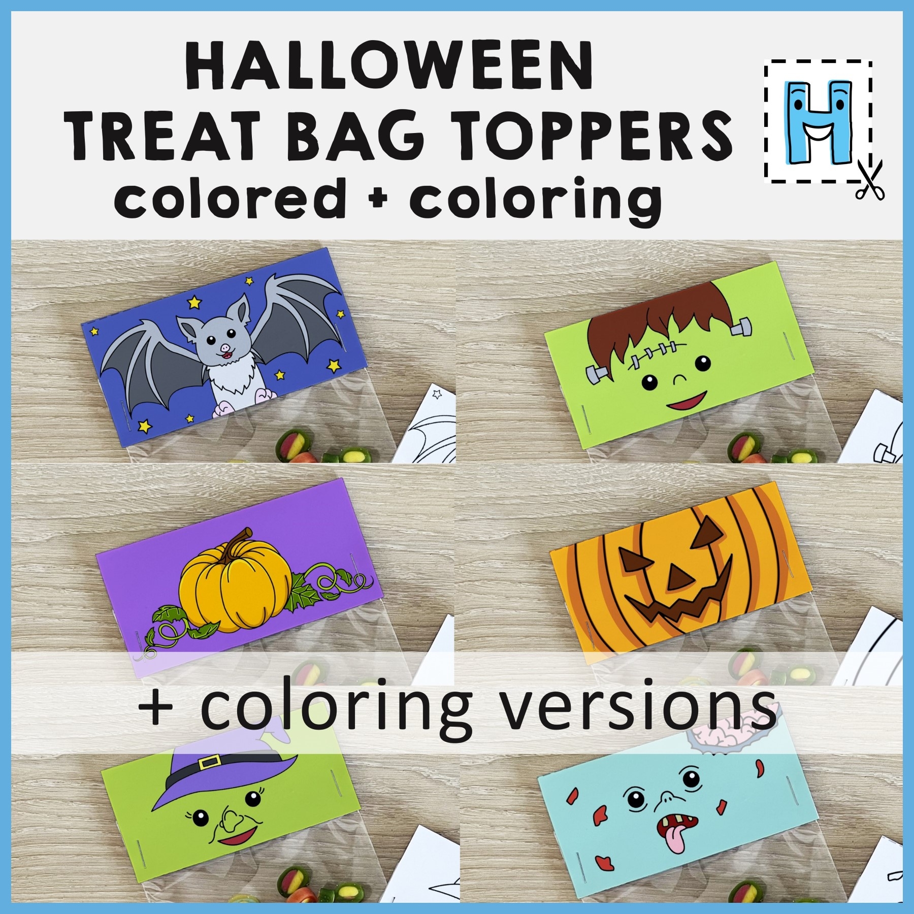Halloween Treat Bag Topper Printable Coloring Activity Craft Decor Bat Witch Pumpkin