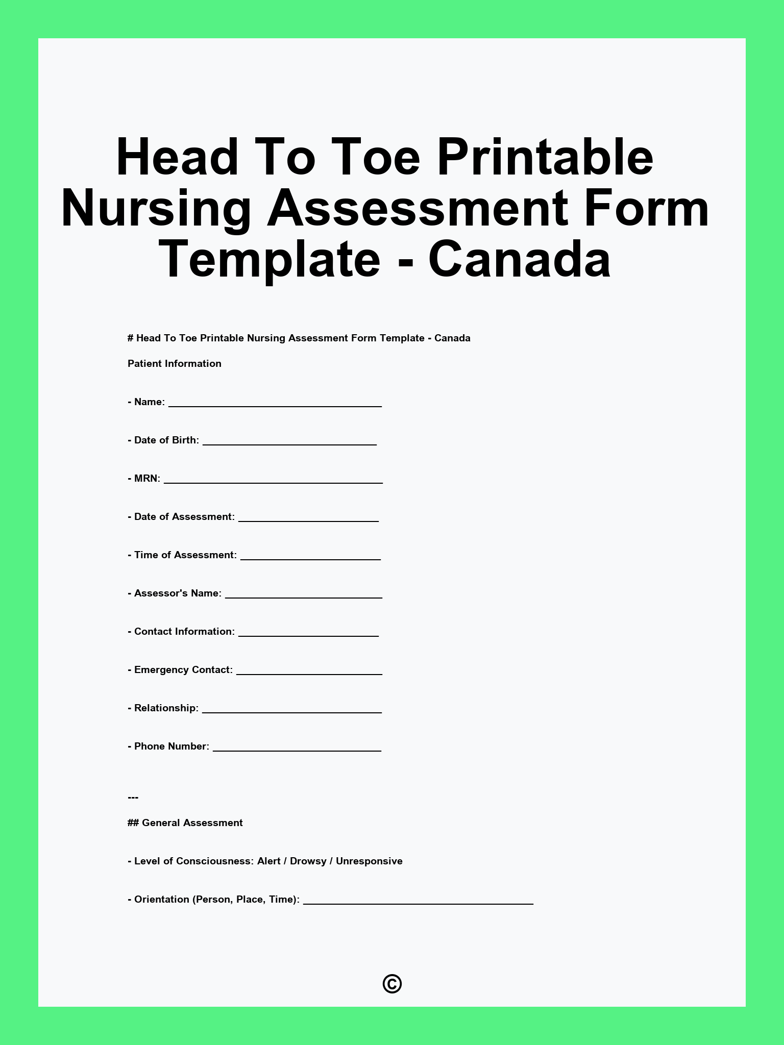 Head To Toe Printable Nursing Assessment Form Template Canada