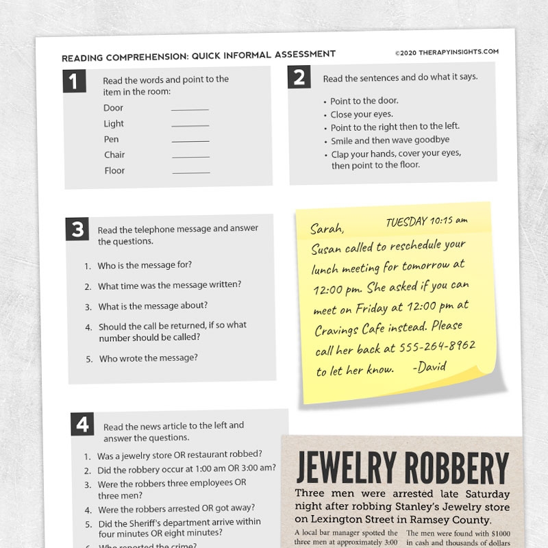 Quick Informal Assessment Reading Comprehension Adult And Pediatric Printable Resources For Speech And Occupational Therapists