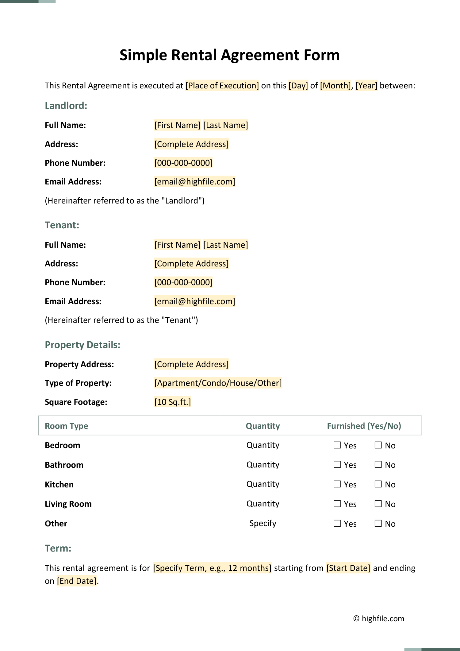 Simple Rental Agreement Form Word PDF Google Docs Highfile
