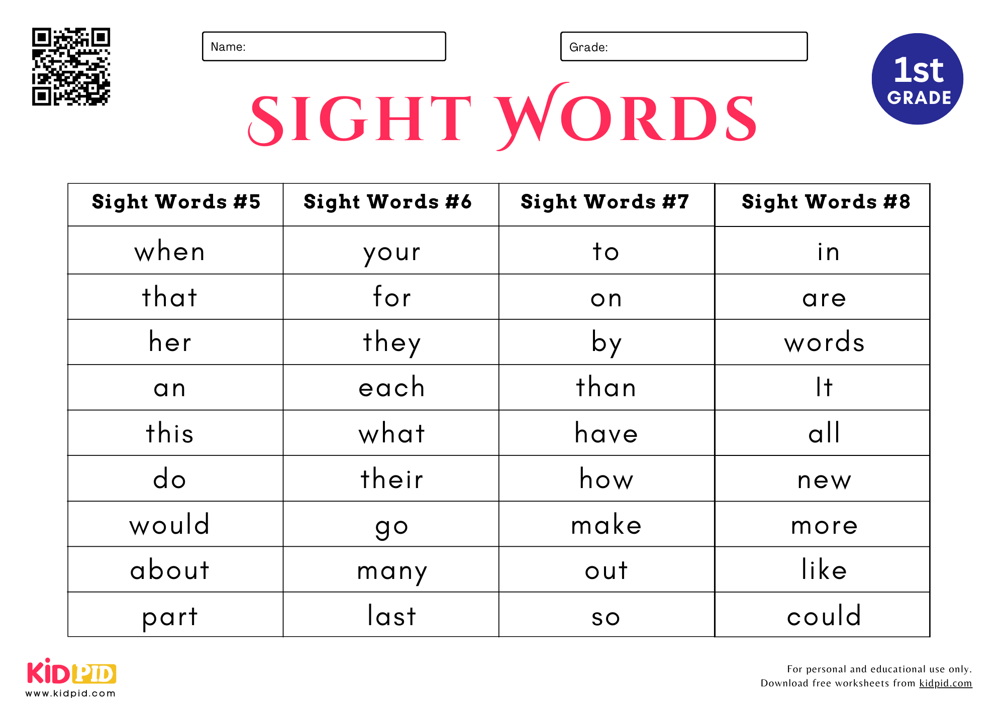 Free Printable First Grade Sight Words Worksheets