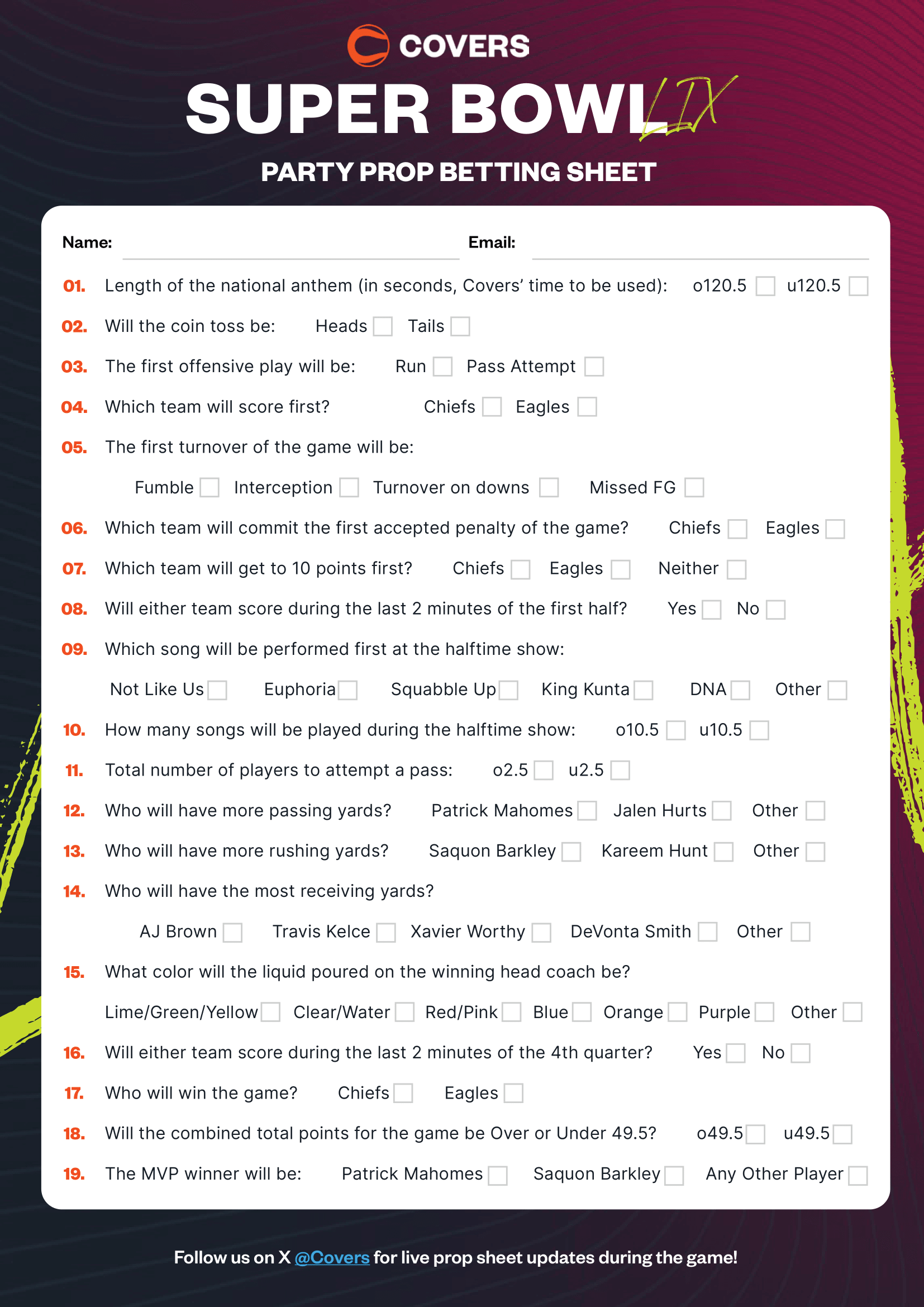 Printable Super Bowl 2025 Party Prop Bets Sheet For Chiefs Vs
