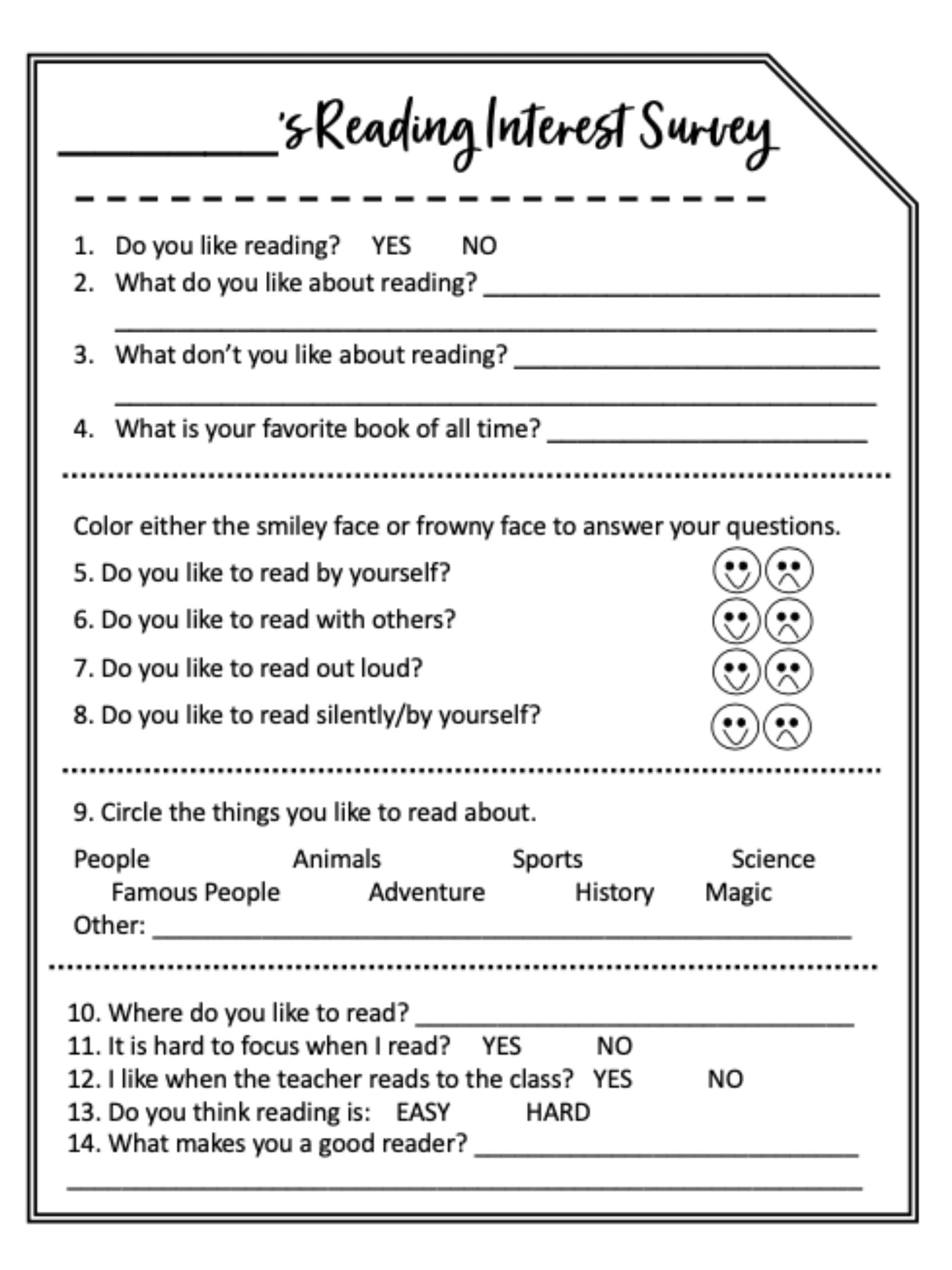 Reading Interest Survey Etsy