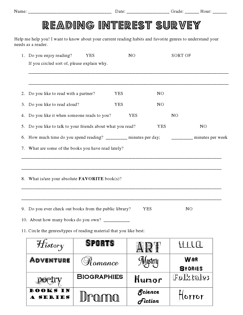Free Reading Interest Survey For Elementary Students