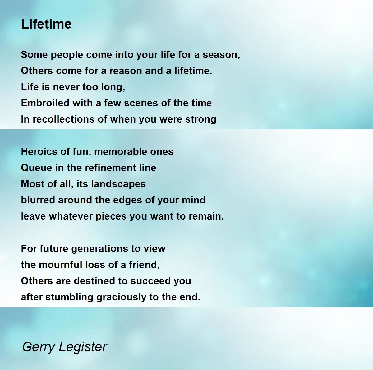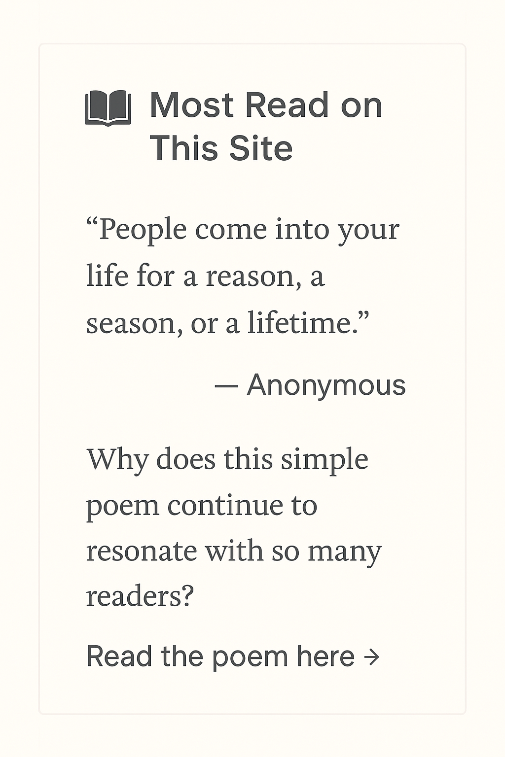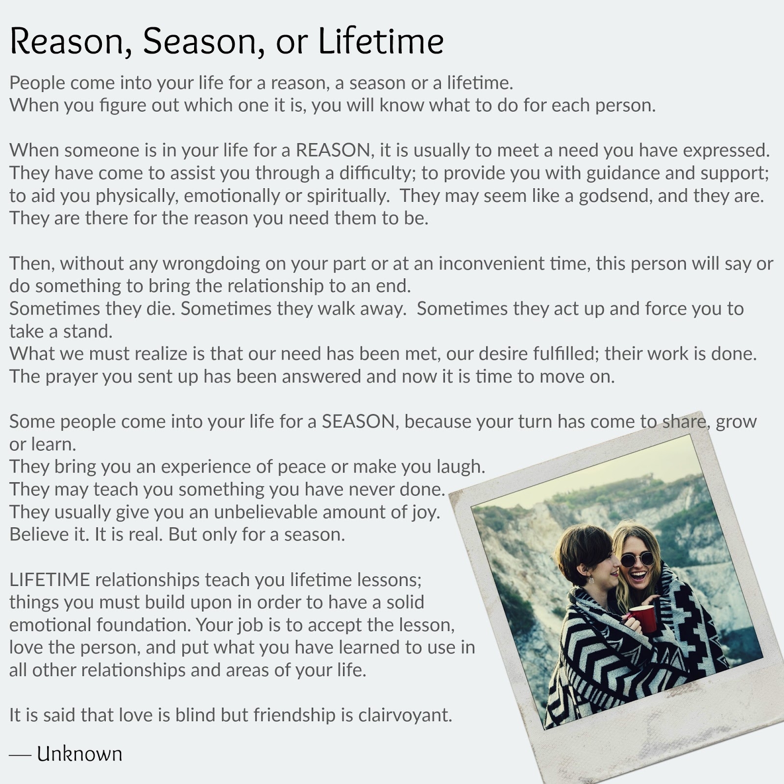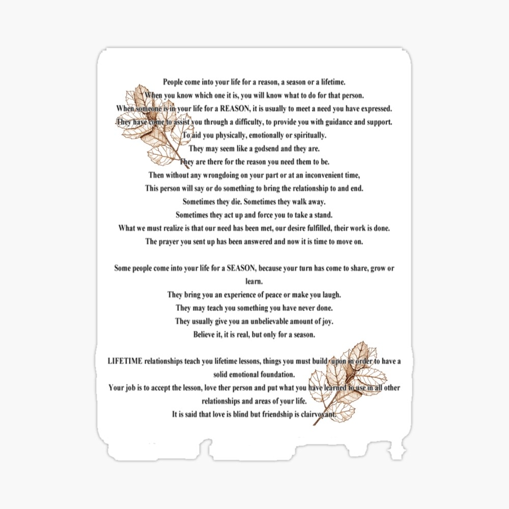 So, next time you come across the “Reason, Season, Lifetime” poem, take a moment to reflect on the relationships in your life. Print out a copy of the poem and keep it as a reminder of the different types of connections we make along the way. Each relationship, no matter how long or short, has its own special significance.