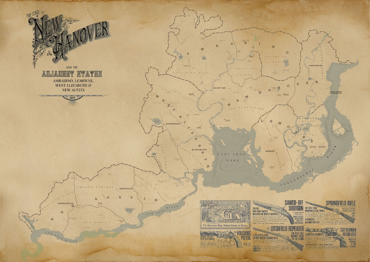Red Dead Redemption 2 5 States Map High Quality A3 A2 A1 Prints
