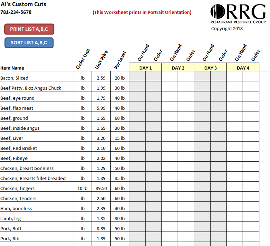 Restaurant Vendor Order Guide Workbook Spreadsheet