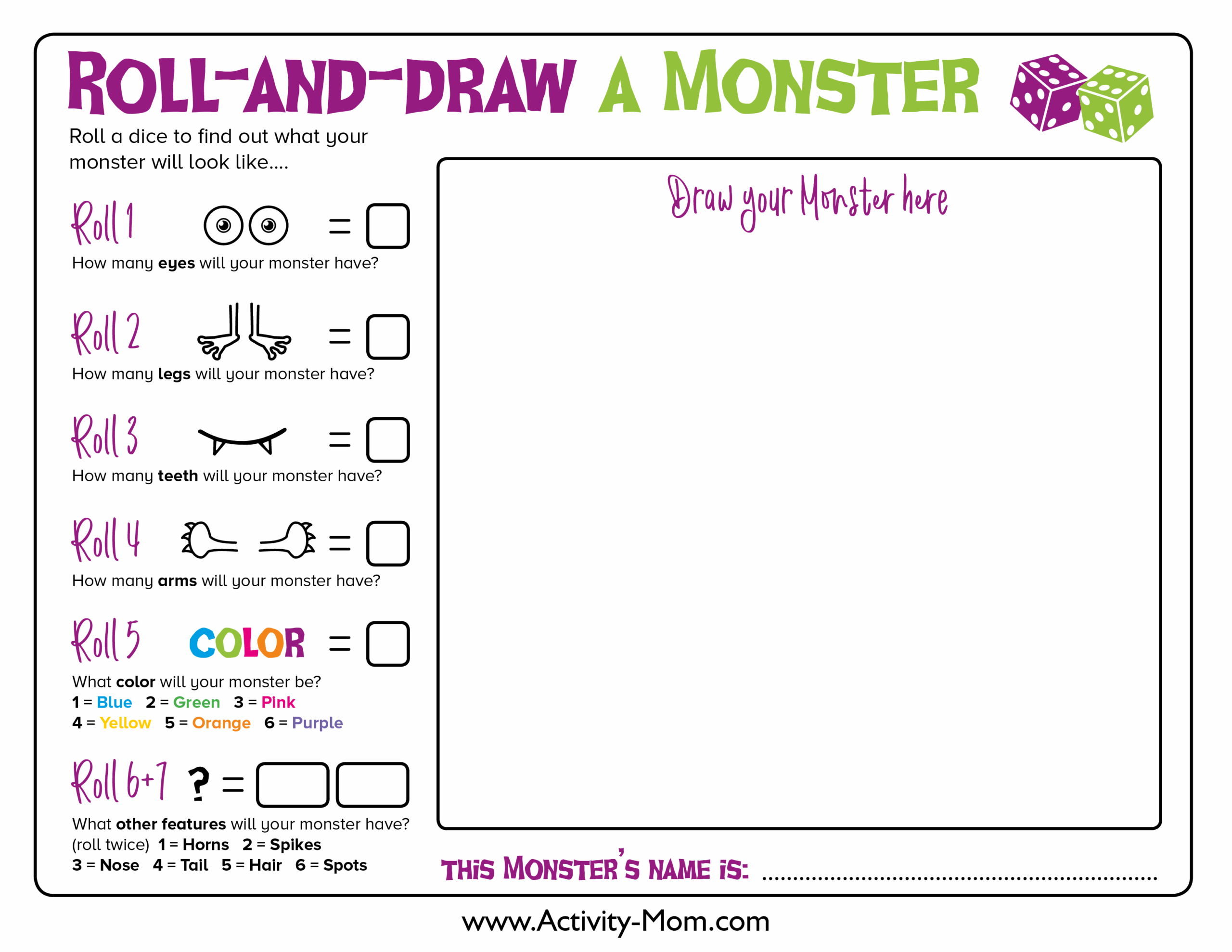 All you need to do is print out the game sheet, grab some dice, and let the fun begin! Your kids can take turns rolling the dice and creating their own unique monsters by combining different body parts, colors, and accessories.