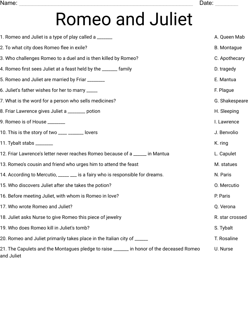 Romeo And Juliet Worksheet WordMint