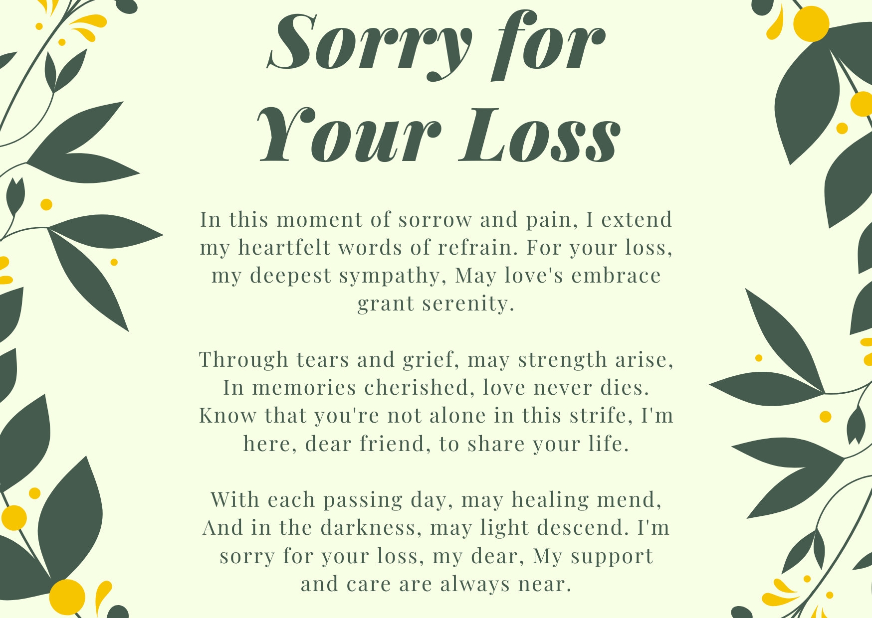 Remember that the most important thing is to show your support and let your loved one know that you are there for them during this difficult time. A sorry for your loss card printable can be a meaningful gesture that provides comfort and reassurance when words alone may not be enough.