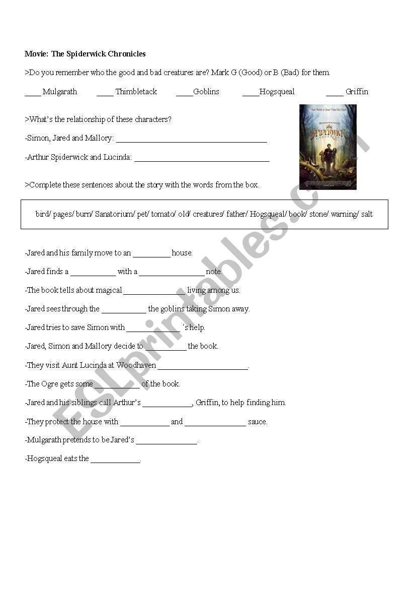 Movie The Spiderwick Chronicles With Keys ESL Worksheet By Nanda83